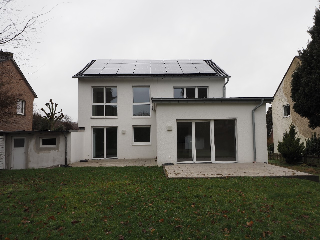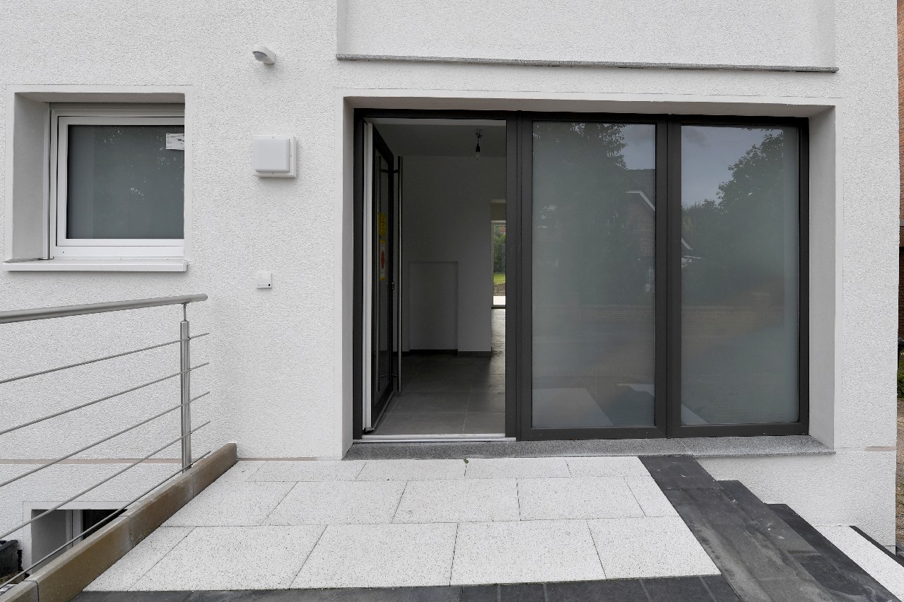 Ein großes Fenster- / Türelement sorgt für reichlich Lichteinfall und gewährt den Zugang in den zum Süden ausgerichteten Garten. Bei sonnigem Wetter können Sie das Frühstück oder entspannte Grillabende auf der ca. 30 m² (Grundfläche) großen Terrasse genießen.