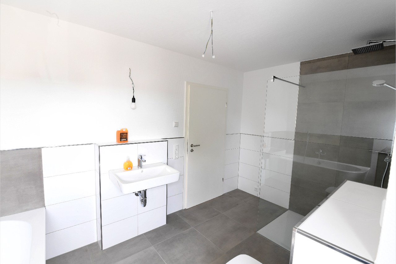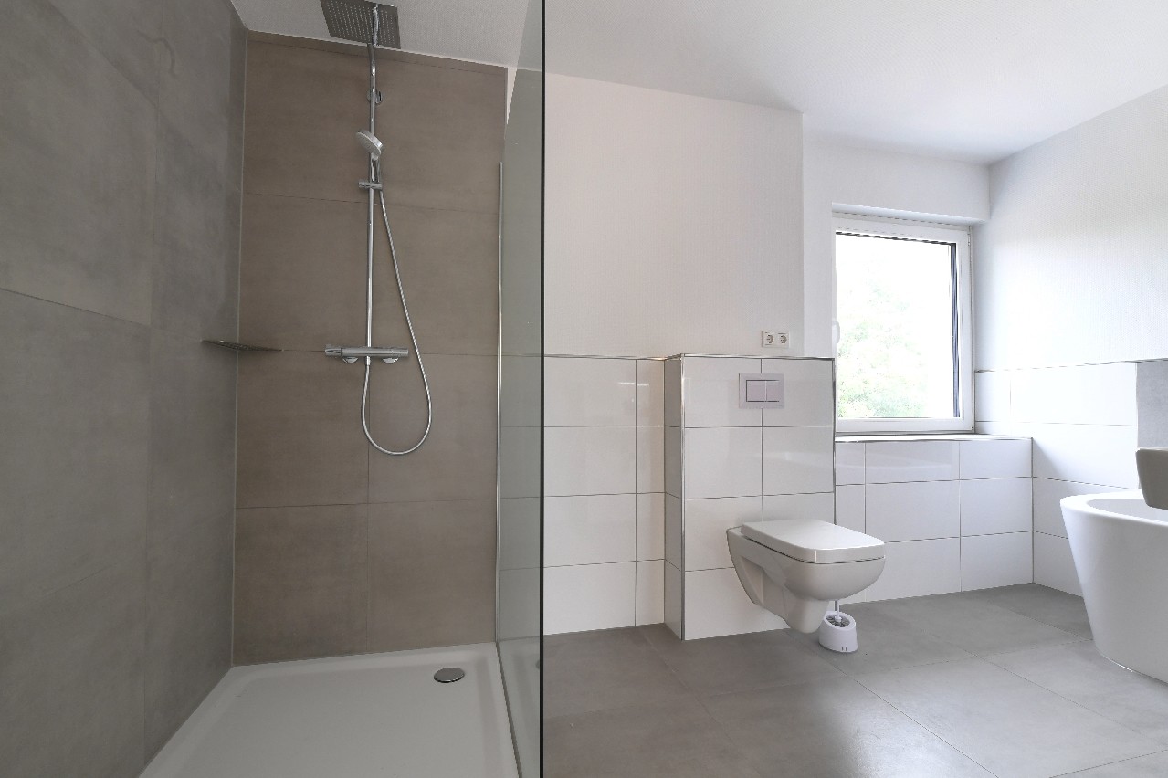Das große Badezimmer mit einer ebenerdigen Dusche und einer Badewanne ist dem Stil des Hauses entsprechend modern und zeitgemäß ausgestattet.