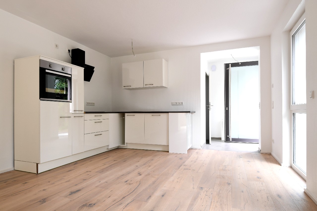 Praktischerweise integriert sich die Küche in den Grundriss des Wohn- / Esszimmers und bietet viel Platz und Arbeitsfläche.